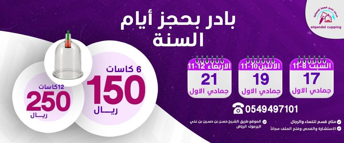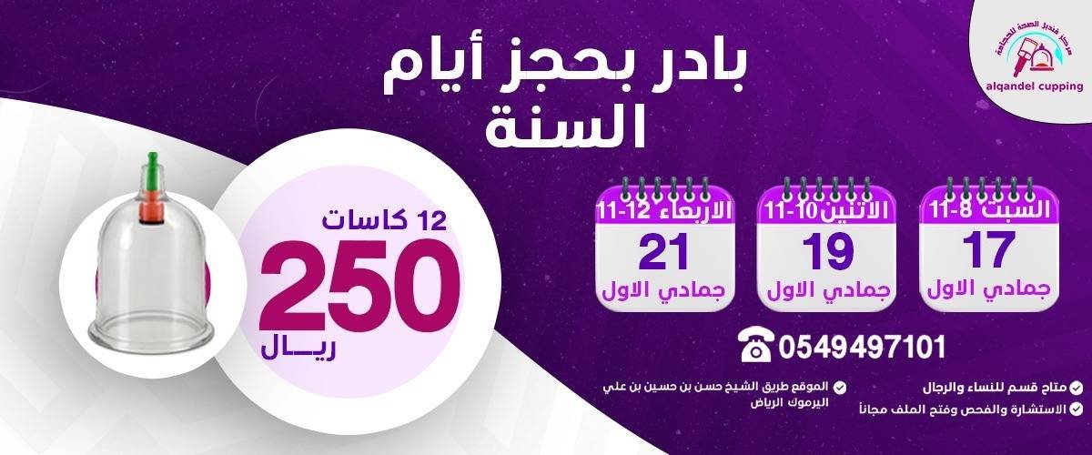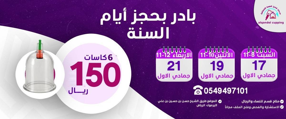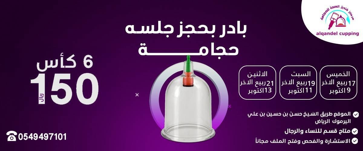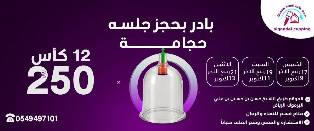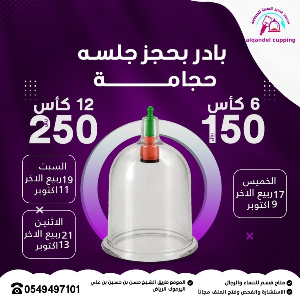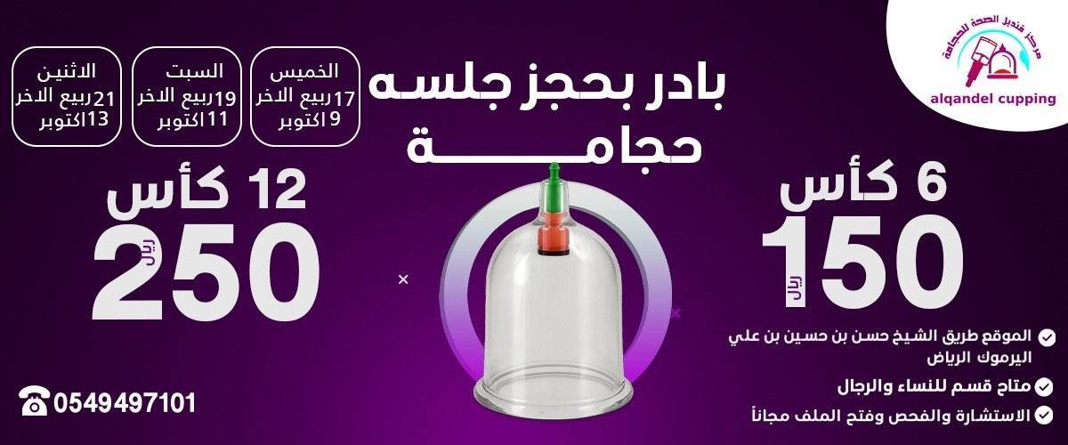 مركز قنديل الصحة للحجامة جلسة الحجامة الوقائية 6 كاسات 150 ريال وجلسة الحجامة العلاجية 12 كأس 250 ريال طريق الشيخ حسن بن حسين بن علي اليرموك الرياض ليس لدينا فروع اخرى للإستفسار 0549497101