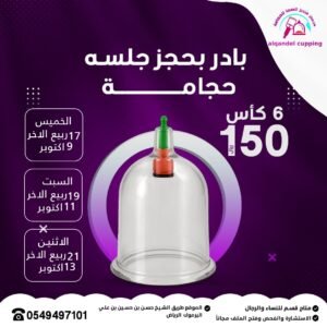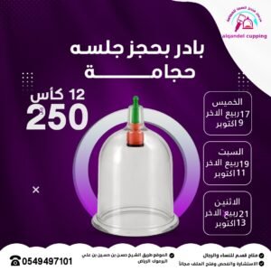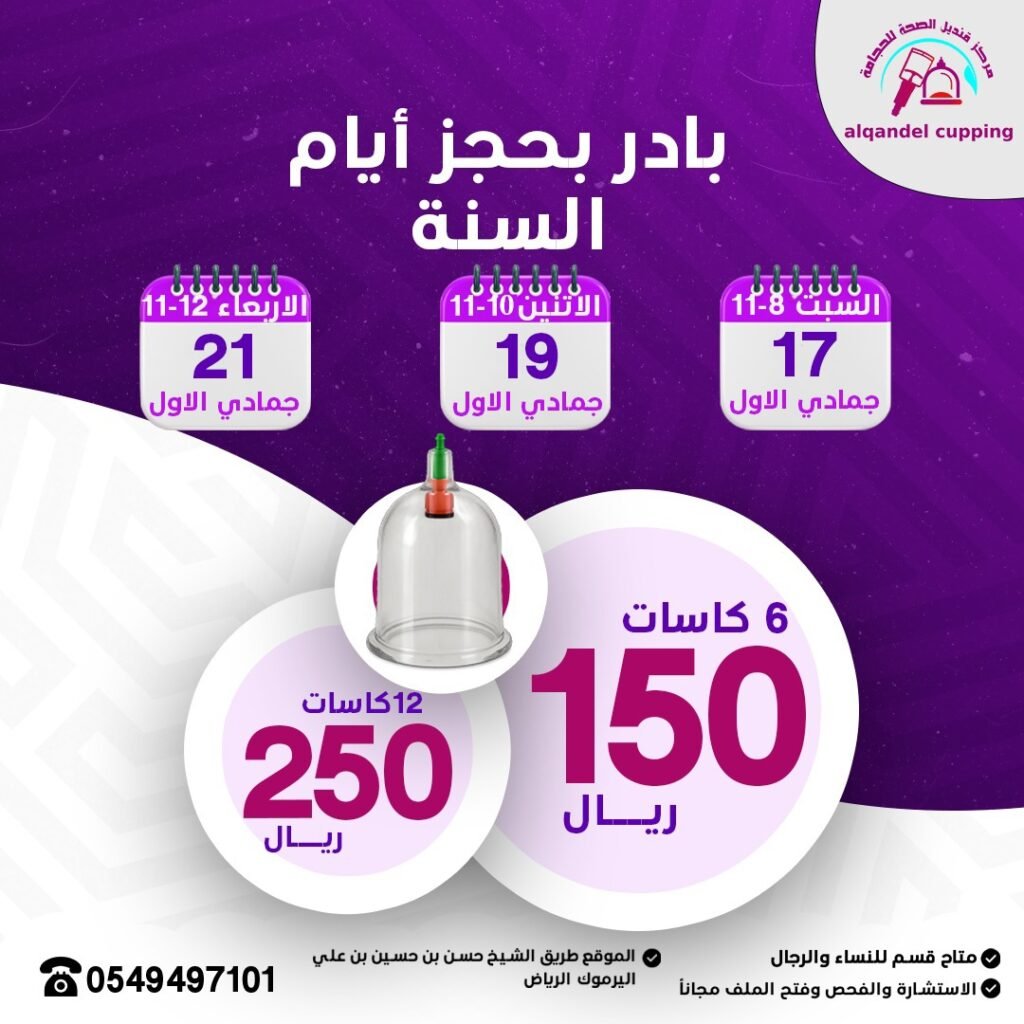 مركز قنديل الصحة للحجامة جلسة الحجامة الوقائية 6 كاسات 150 ريال وجلسة الحجامة العلاجية 12 كأس 250 ريال طريق الشيخ حسن بن حسين بن علي اليرموك الرياض ليس لدينا فروع اخرى للإستفسار 0549497101